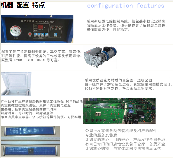 使用說(shuō)明;1.插上電源插頭.交流220伏.2.打開電源按扭于開位置.3.調(diào)節(jié)抽氣時(shí)間(一般30-35秒左右).4.調(diào)節(jié)加熱(封口)時(shí)間(一般2.5-3.5秒).5.裝好物品.放置箱內(nèi)在封口處.6.按(壓)下頂蓋(有機(jī)玻璃蓋.看到真空表指針走動(dòng)手松開)即可自動(dòng)操作.真空表回零即工作完成.